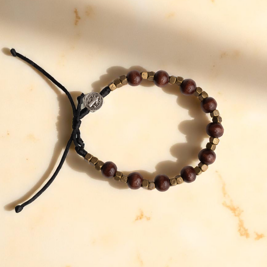 Tento pánsky jedno desiatkový ruženec na ruku je vyrobený z tmavohnedých drevených korálikov, doplnený o mosadzné koráliky. Ruženec je doplnený o medailónik s kresťanským motívom. Vďaka nastaviteľnej šnúrke sa pohodlne prispôsobí zápästiu a je ideálny na každodenné nosenie. Je navrhnutý pre muža, ktorý chce žiť svoju vieru v každom okamihu života. Je pripomienkou Božej prítomnosti, ochrany a pokoja.